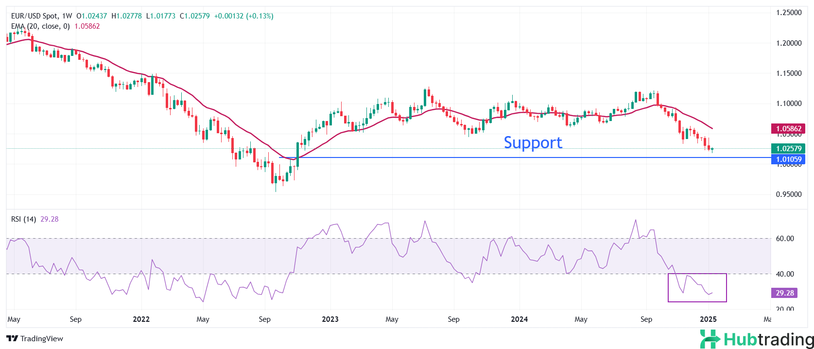EUR/USD climbs to around 1.0270 during Tuesday’s European session, recovering from Monday’s more-than-two-year low of 1.0175. However, the broader outlook remains bearish as the 20-week Exponential Moving Average (EMA) trends lower at 1.0585.