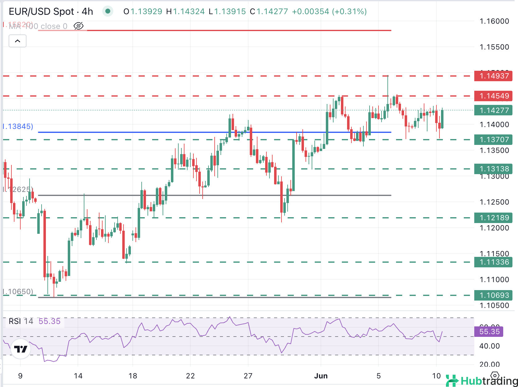 The pair is currently hovering above 1.1400, with key support at 1.1375—the lows from June 6 and 10. A clear break below this level would indicate a deeper correction toward 1.1315 (May 30 low) and potentially the 1.1215–1.1220 zone (lows from May 20 and 28).