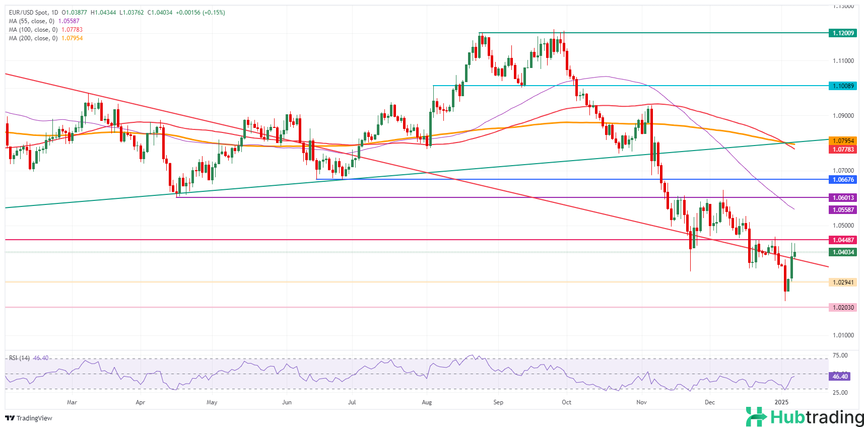 EUR/USD has experienced a solid technical bounce, finding support at 1.0294 and rallying to nearly 1.0448. The key question now is whether the Euro can push past 1.0450. If European bonds lose their momentum from Monday’s highs, the Euro may struggle to extend higher toward the 1.05 mark.