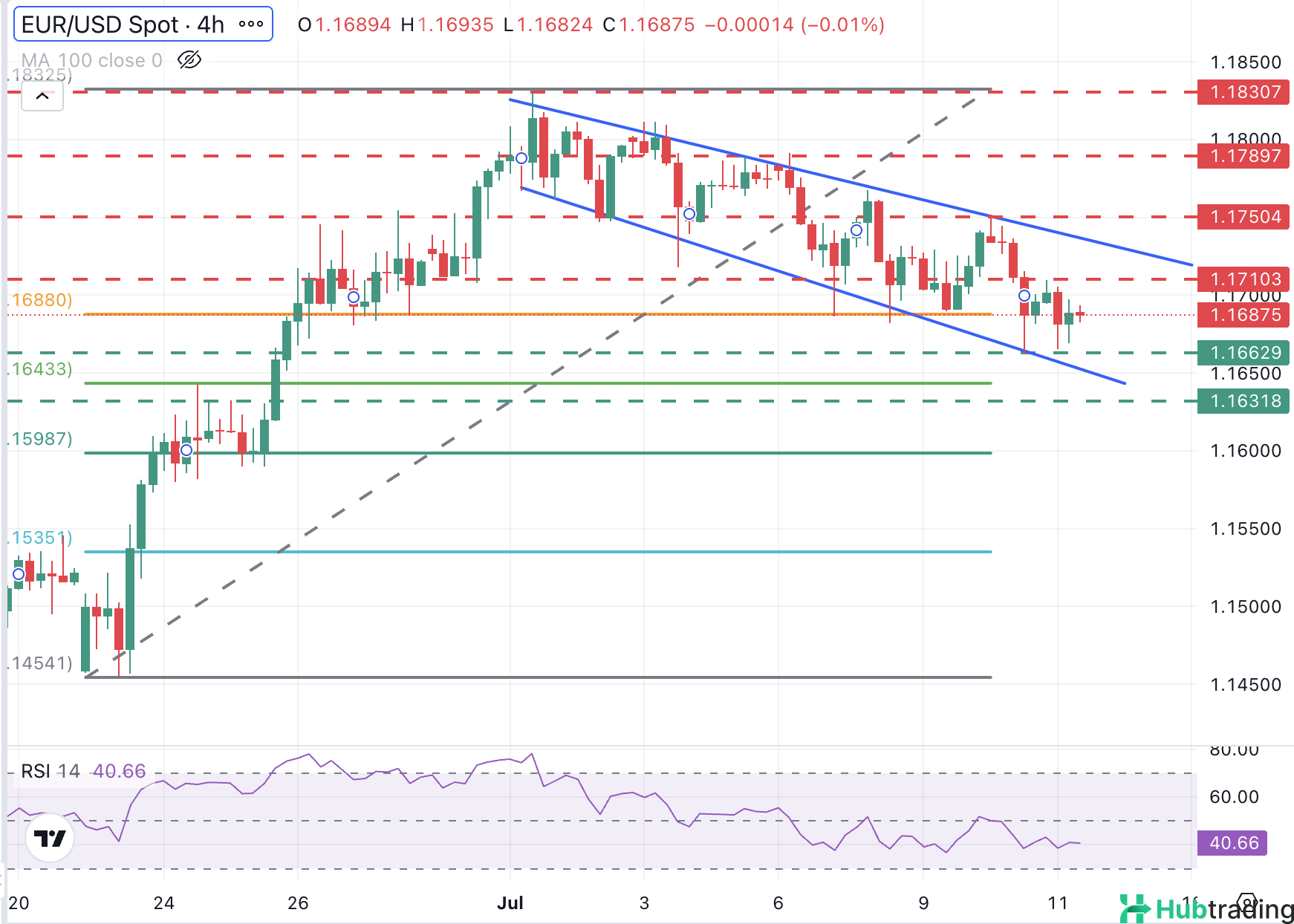 The EUR/USD pair continues to trend lower, extending a corrective pullback from its July 1 peak at 1.1830. Price action remains locked in a descending channel, forming a series of lower highs and lower lows. Support is currently holding between Thursday’s low at 1.1660 and the lower boundary of the channel near 1.1650. A decisive break below this zone could accelerate bearish momentum, while any upside recovery would face resistance from the upper edge of the wedge pattern.