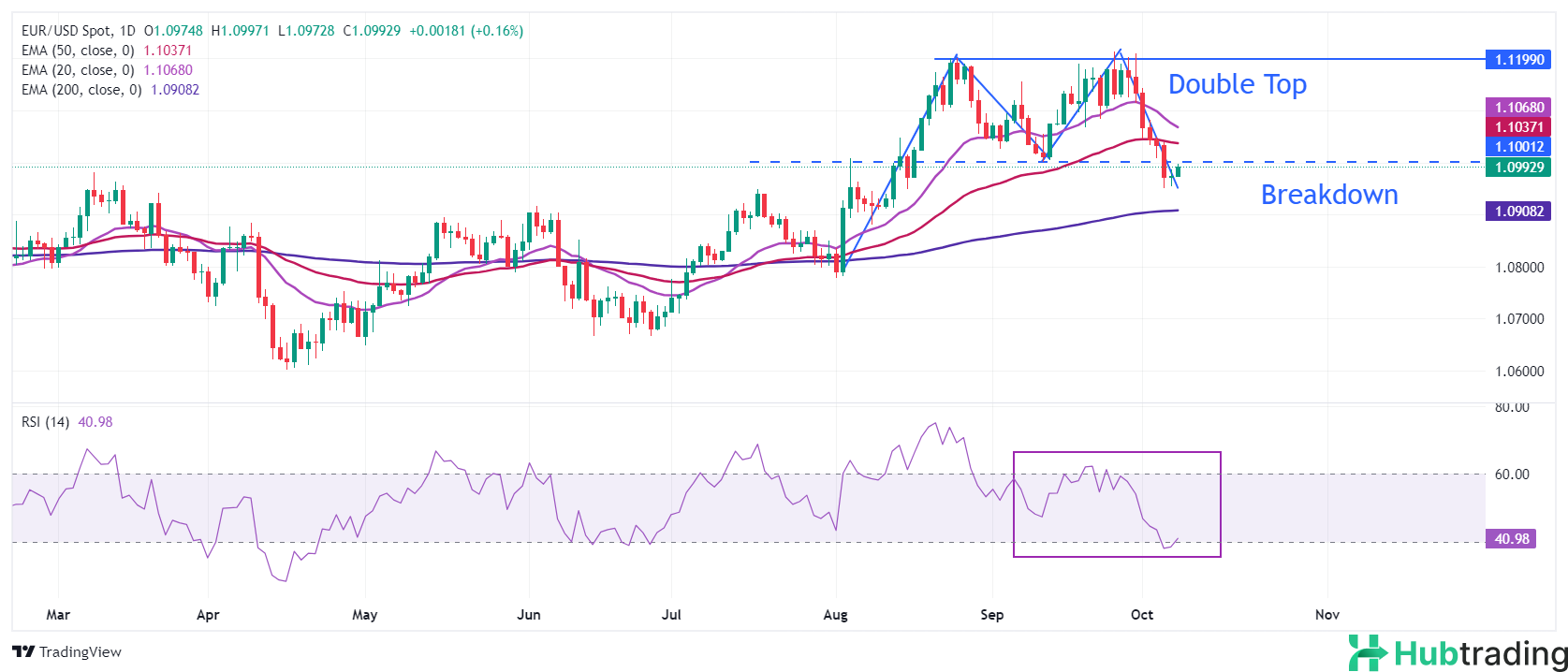 EUR/USD gains some ground near immediate support at 1.0950 but remains broadly under pressure after breaking down from a Double Top chart pattern on the daily timeframe. This pattern was triggered when the pair fell below the September 11 low of 1.1000.