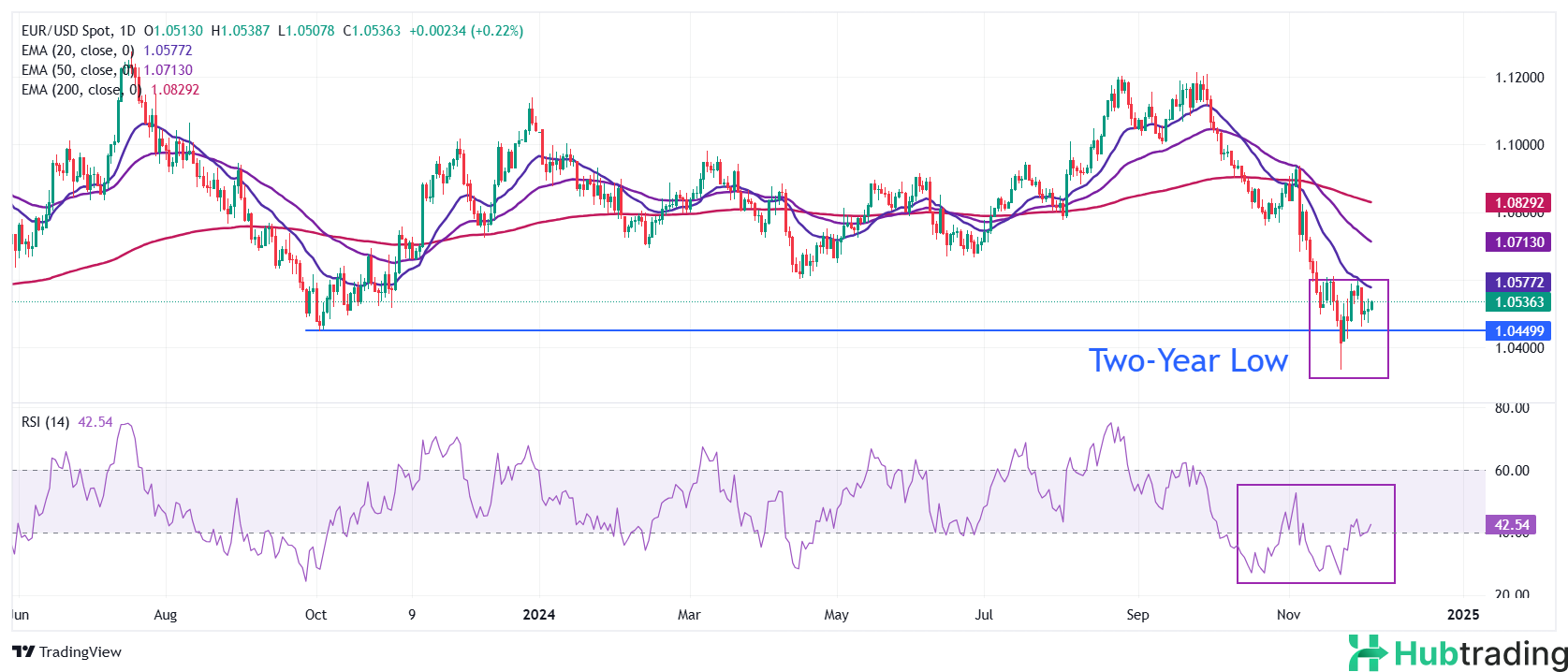 The EUR/USD pair climbs above 1.0550, driven by a weaker US Dollar (USD). The US Dollar Index (DXY), which measures the USD against six major currencies, fell below the critical support level of 106.00 after the US Department of Labor reported higher-than-expected Initial Jobless Claims. For the week ending November 29, jobless claims rose to 224K, surpassing both the 215K prior reading and market forecasts.