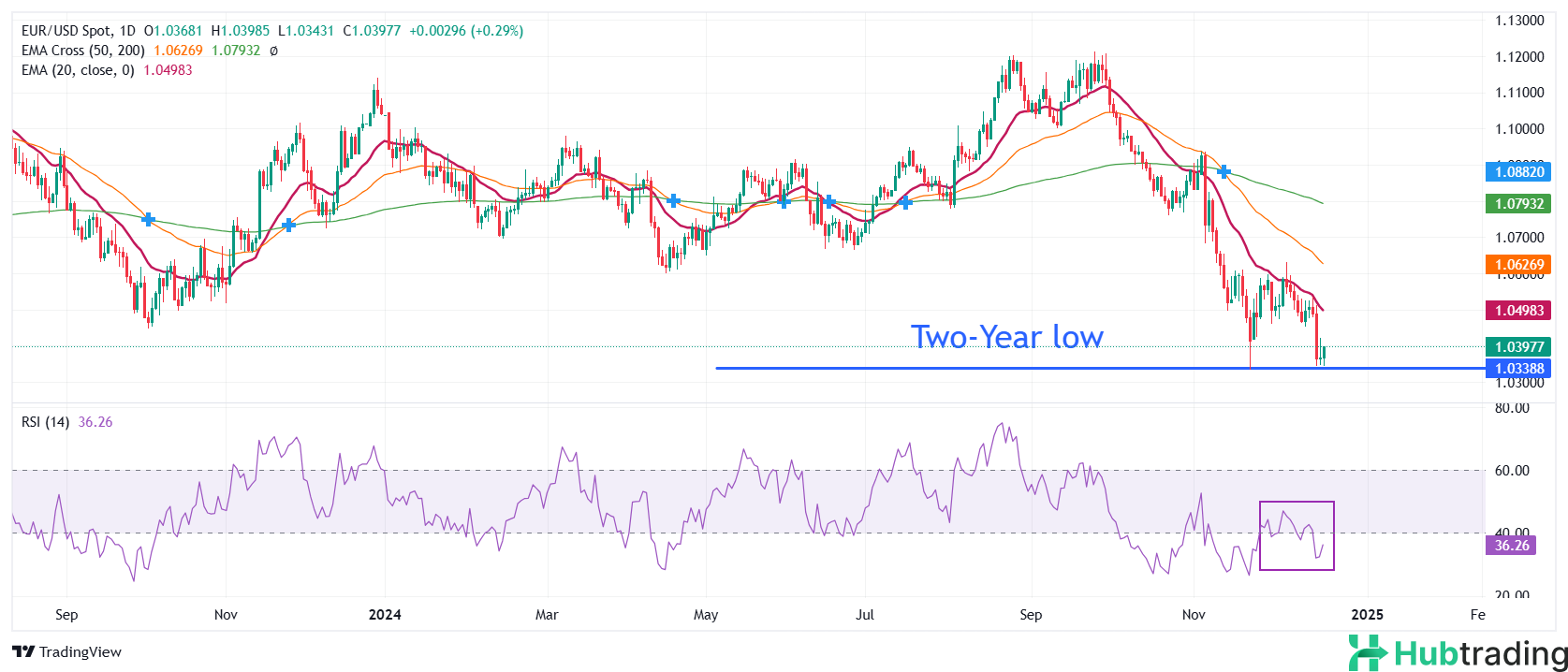 On the downside, a break below the two-year low of 1.0330 could expose the pair to further declines toward the psychological support level of 1.0200. On the upside, the 20-day EMA near 1.0500 presents a critical resistance level for Euro bulls to reclaim to shift the near-term bias.