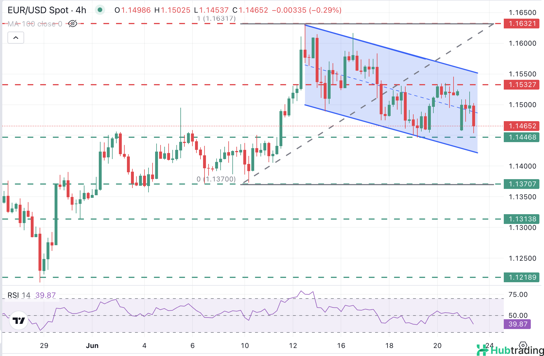 The EUR/USD pair has managed a mild rebound on Monday but remains confined within a descending channel from mid-June highs at 1.1630. Immediate resistance lies between 1.1535 and 1.1545, which previously capped gains on June 18 and 20. The upper boundary of the bearish channel, currently around 1.1555, reinforces this resistance zone.