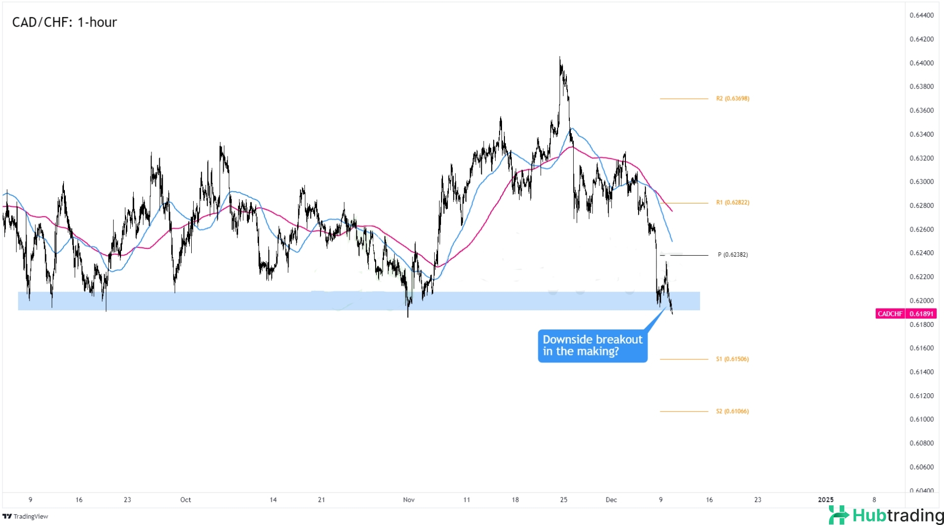 A dovish BoC could accelerate CAD/CHF’s downward momentum, with the pair currently testing a critical support zone on the 1-hour chart. Sustained trading below the .62000 psychological level could attract more sellers, paving the way for potential declines toward .6150 or even .6100.