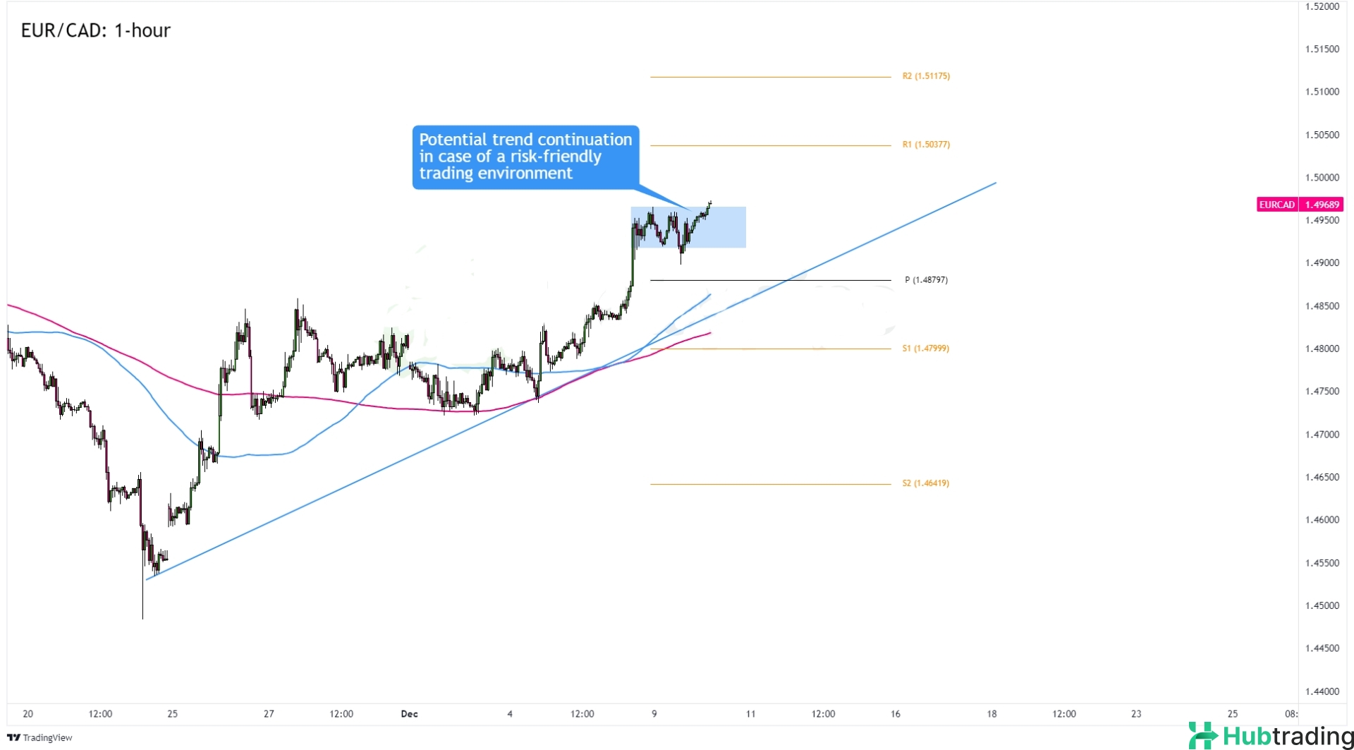 In a risk-friendly environment, bullish candlesticks could signal a breakout above 1.5000, particularly if BoC officials hint at further easing despite significant rate cuts. Should momentum continue, the pair could target the R1 Pivot Point at 1.5038, especially if the ECB policy announcement strengthens the bullish outlook.