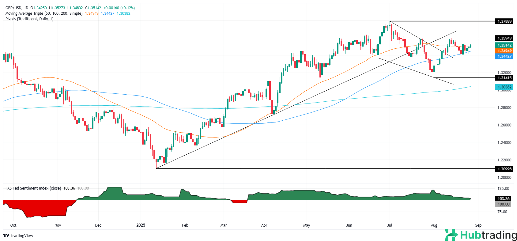 GBP/USD extended its three-day rally, climbing above the 50-day SMA at 1.3494 and reclaiming the 1.3500 handle. A daily close above this zone would open the door toward 1.3550 and the August 14 swing high at 1.3594, with 1.3600 in sight.