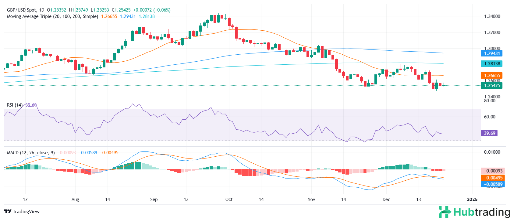 GBP/USD continues to face bearish momentum, with the Relative Strength Index (RSI) dipping below 40, signaling potential for further downside. The Moving Average Convergence Divergence (MACD) indicator also prints red bars, reflecting strong bearish pressure.