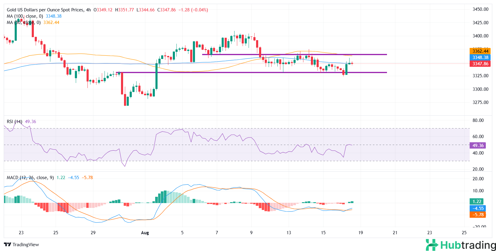 Gold (XAU/USD) continues to trade sideways, trapped in a well-defined consolidation range on the 4-hour chart. Immediate support lies at $3,330, while resistance is capped around $3,370. Price action suggests indecision, with neither bulls nor bears showing clear dominance ahead of major events.