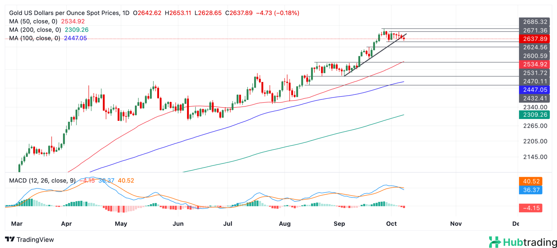 Gold is currently testing a crucial trendline while continuing to trade within a narrow sideways range, characterized by a ceiling around $2,673 (the high from October 1) and a floor at $2,632 (the low from October 4).