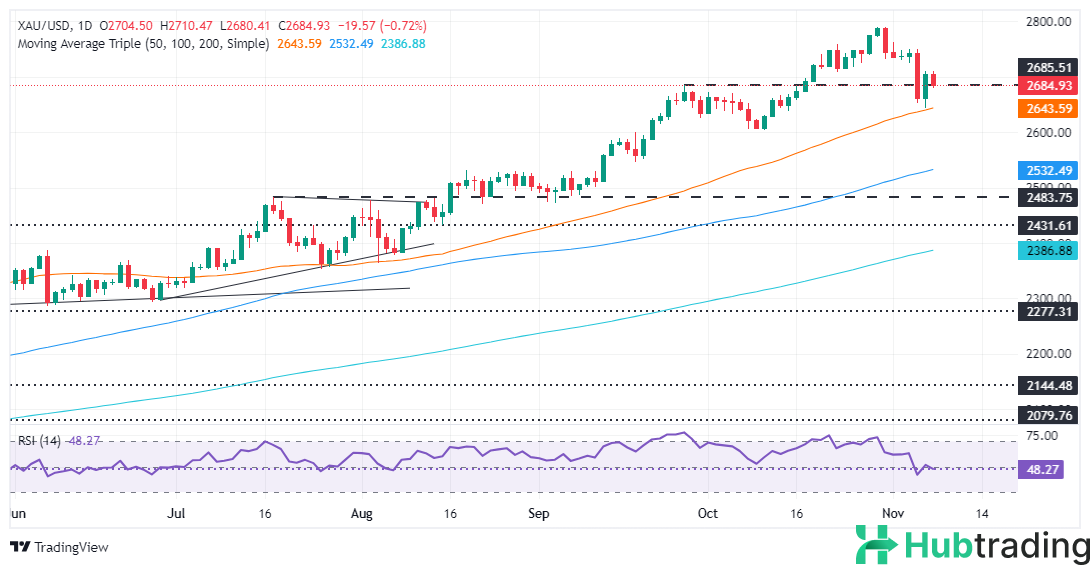 Gold prices declined on Friday as the US Dollar rebounded, despite falling US Treasury yields. Traders continued to digest Donald Trump’s election victory, scaling back their positions on the so-called "Trump trade" amid uncertainty over tariff policies. As of now, XAU/USD trades at $2,688, down more than 0.67%.