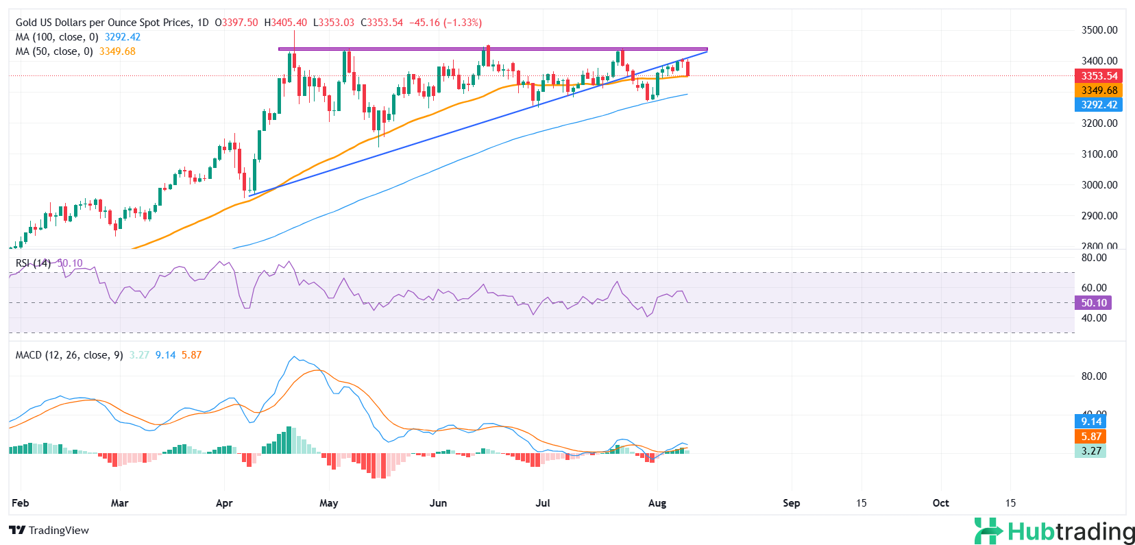 On the daily chart, the metal is encountering selling pressure near the rising trendline of an ascending triangle pattern. While a brief downside break occurred in late July, the broader bullish structure remained intact due to the lack of follow-through. However, the latest rejection from this trendline suggests that bulls are losing momentum.