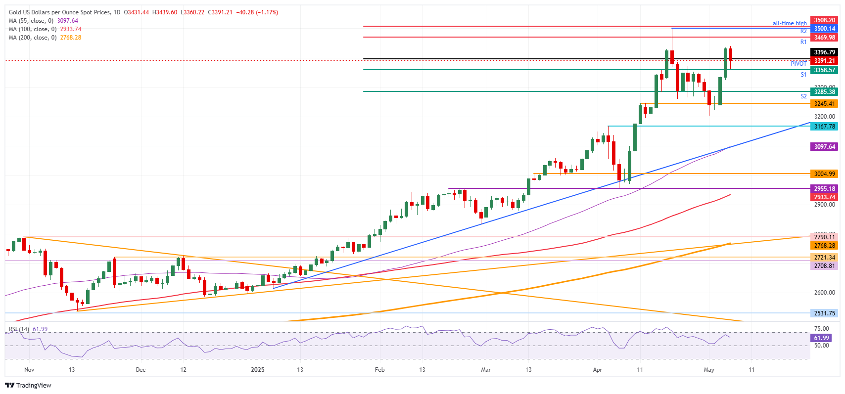 Gold (XAU/USD) dropped over 1% on Wednesday to $3,391 ahead of the Federal Reserve's (Fed) rate decision, following announcements from both China and the United States (US) confirming trade talks this weekend. US Treasury Secretary Scott Bessent and US Trade Representative Jamieson Greer will travel to Switzerland later this week for discussions with the Chinese delegation, led by Vice Premier He Lifeng, aimed at easing tariff tensions that threaten both economies. Initially, the focus will be on de-escalation rather than formal trade negotiations, according to Bessent on Fox News.