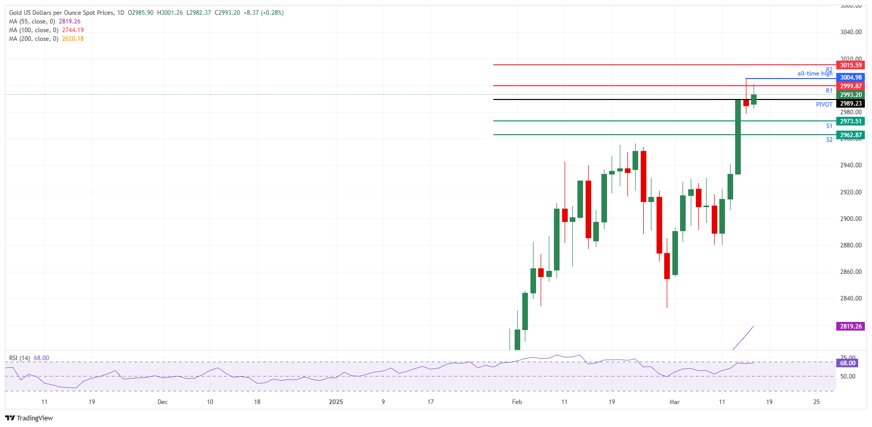 - Gold hovers just below $3,000 at the start of the week after reaching a record high on Friday.