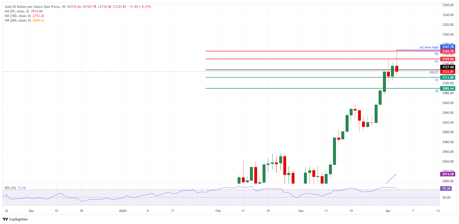 Gold price (XAU/USD) experiences a pullback after briefly reaching a fresh all-time high of $3,167 in the early Asian session. Traders are taking profits, pushing the precious metal's price down to $3,130 as of Thursday. Markets are still absorbing the shock of US President Donald Trump's announcement of his reciprocal tariff plan, which is having a ripple effect across global markets.