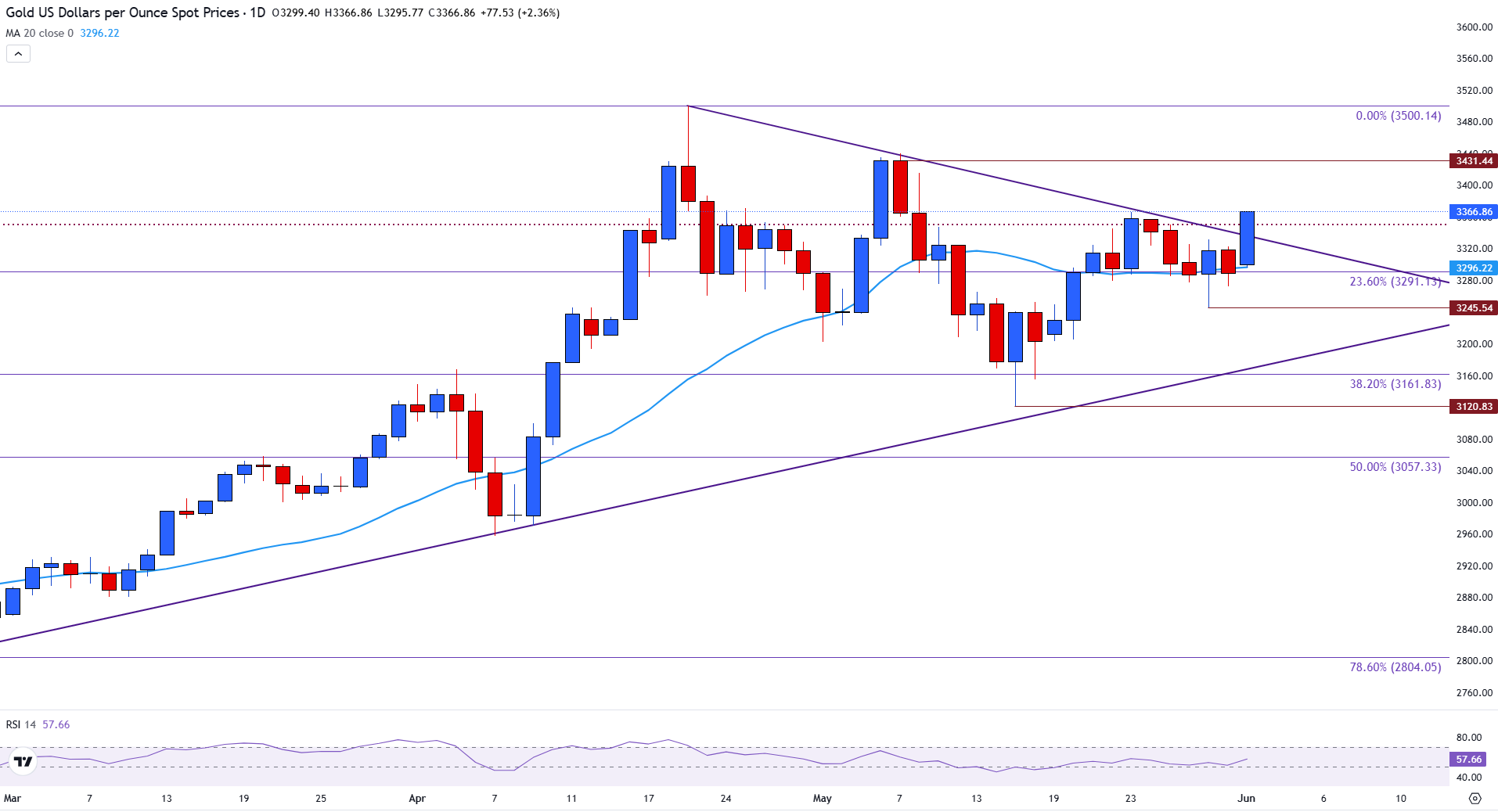 A clear breakout above the trendline resistance could trigger a move toward the May high near $3,431, and possibly a retest of the April 22 all-time high at $3,500.