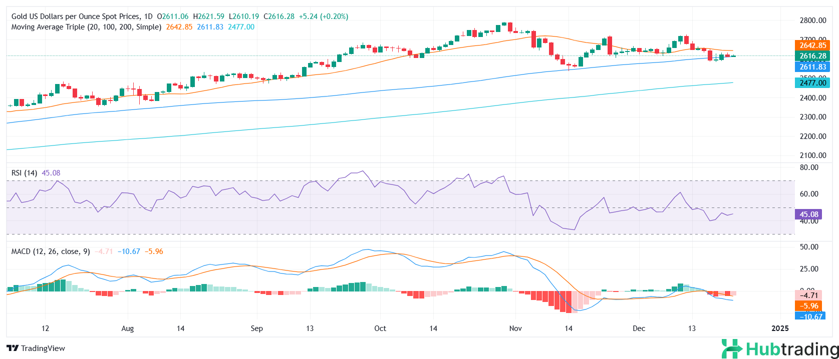 Gold prices remain stable around $2,611 as markets digest the Federal Reserve’s more cautious stance on interest rate cuts. The US Dollar continues to strengthen, underpinned by expectations of a slower pace of rate reductions in 2025, with the federal funds rate projected to reach 3.9% by year-end. This shift reflects stalled progress in disinflation and uncertainty surrounding President-elect Donald Trump’s policies on immigration, trade, and taxes.