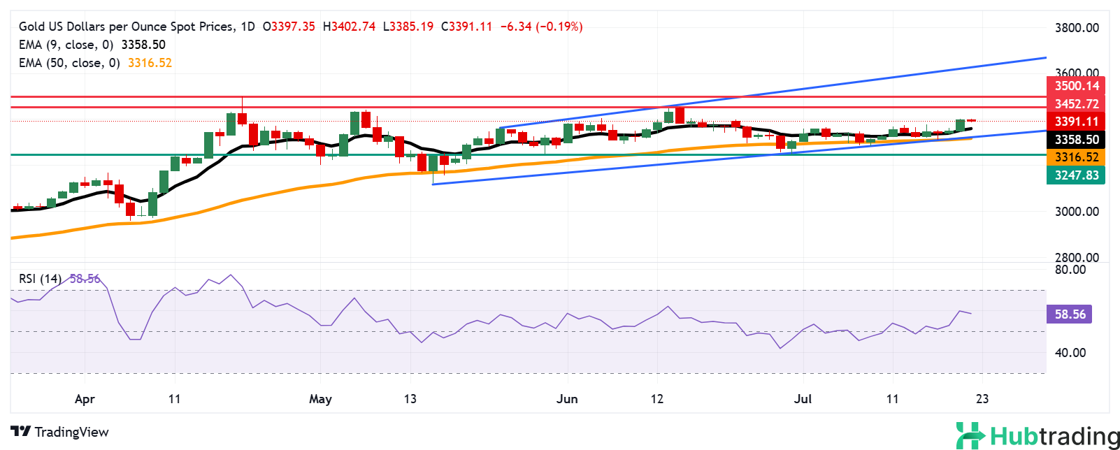 On the downside, the first support lies at the 9-day Exponential Moving Average (EMA) of $3,358. A breach of this level could trigger a deeper pullback toward the channel’s lower boundary and the 50-day EMA at $3,316.