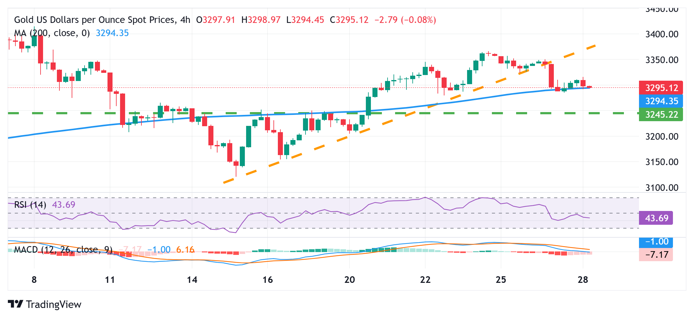 From a technical standpoint, the recent breakdown below a short-term ascending trend line acted as a bearish trigger, inviting selling pressure. A sustained move below the 200-period Simple Moving Average (SMA) on the 4-hour chart and continued weakness under the $3,300 level would reinforce the negative bias. That said, daily chart oscillators—while showing signs of losing momentum—have not yet confirmed a fully bearish outlook. As a result, any further decline may attract dip-buying interest, with strong support expected near the $3,250–$3,245 horizontal zone. A decisive break below this area would open the door for a deeper near-term correction in gold.