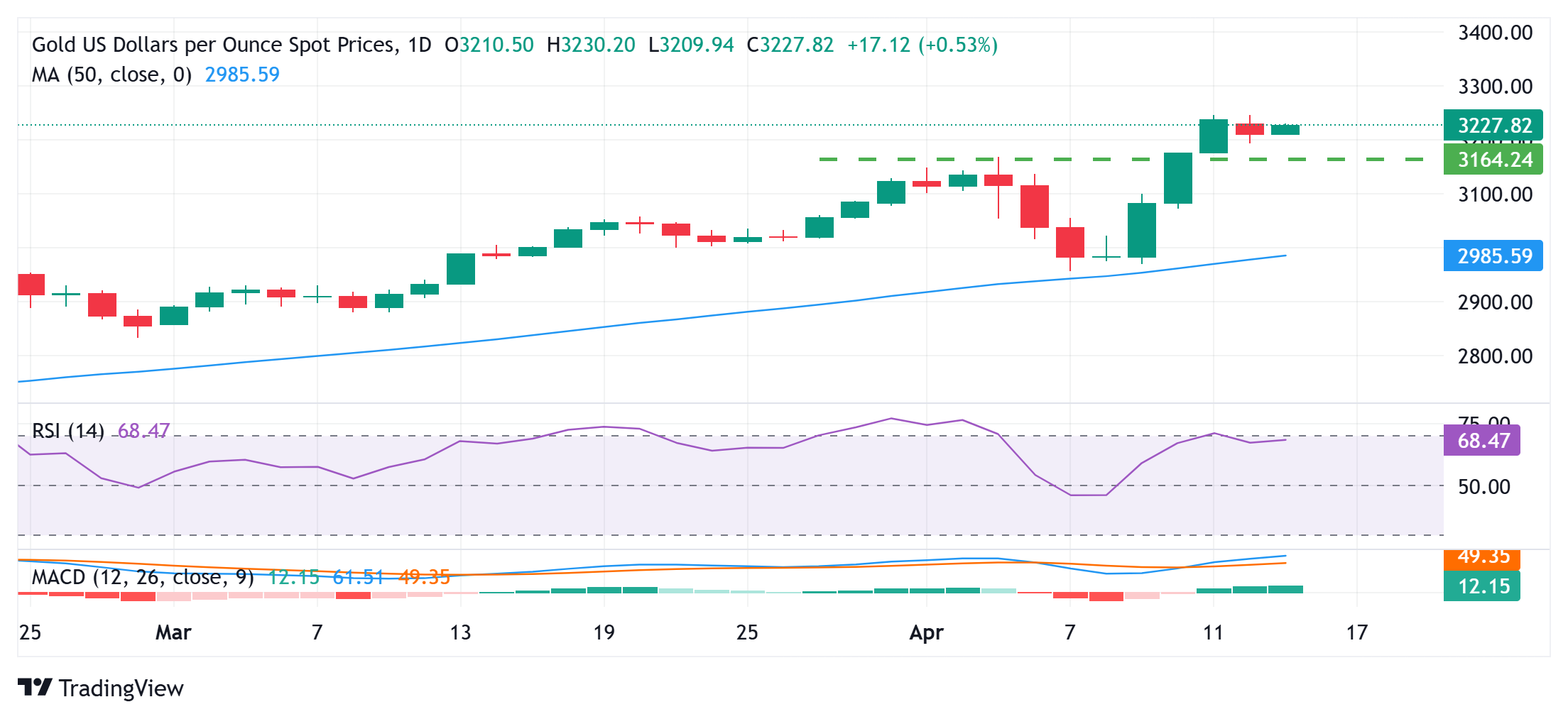 Gold (XAU/USD) continues to trade with a firm tone around the $3,225 level heading into Tuesday’s European session. While the precious metal holds above the $3,200 mark, it lacks strong follow-through buying and remains below the record high set on Monday. Market sentiment remains cautiously optimistic following US President Donald Trump’s temporary suspension of tariffs on key consumer electronics and hints at potential exemptions for the auto industry from the 25% levies. This improvement in risk appetite has limited investors' appetite for new bullish positions in gold.