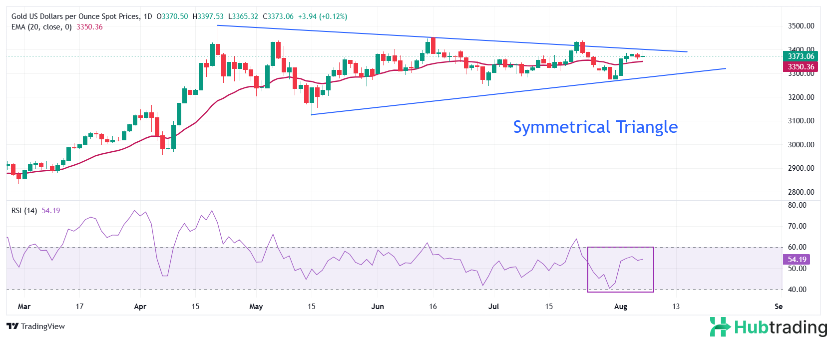 From a technical perspective, gold is trading near the upper boundary of a Symmetrical Triangle pattern, currently hovering around $3,400. This resistance line has been drawn from April’s high near $3,500, while the support line originates from the May low of $3,120.85.