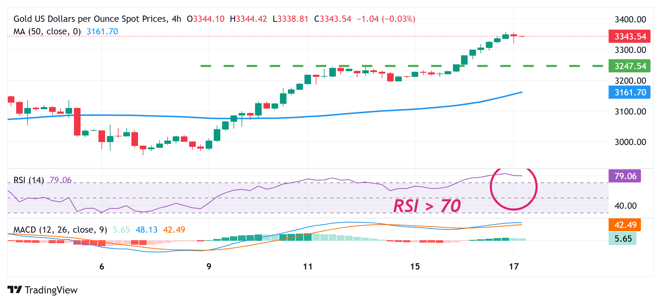 Gold price (XAU/USD) remains pressured below the fresh all-time high reached earlier on Thursday, dipping to a daily low around $3,314 during the first half of the European session. Optimism surrounding US trade negotiations triggered a modest recovery in global risk sentiment, while some US Dollar (USD) buying, bolstered by strong US Retail Sales and hawkish comments from Federal Reserve Chair Jerome Powell on Wednesday, led to profit-taking in the precious metal.