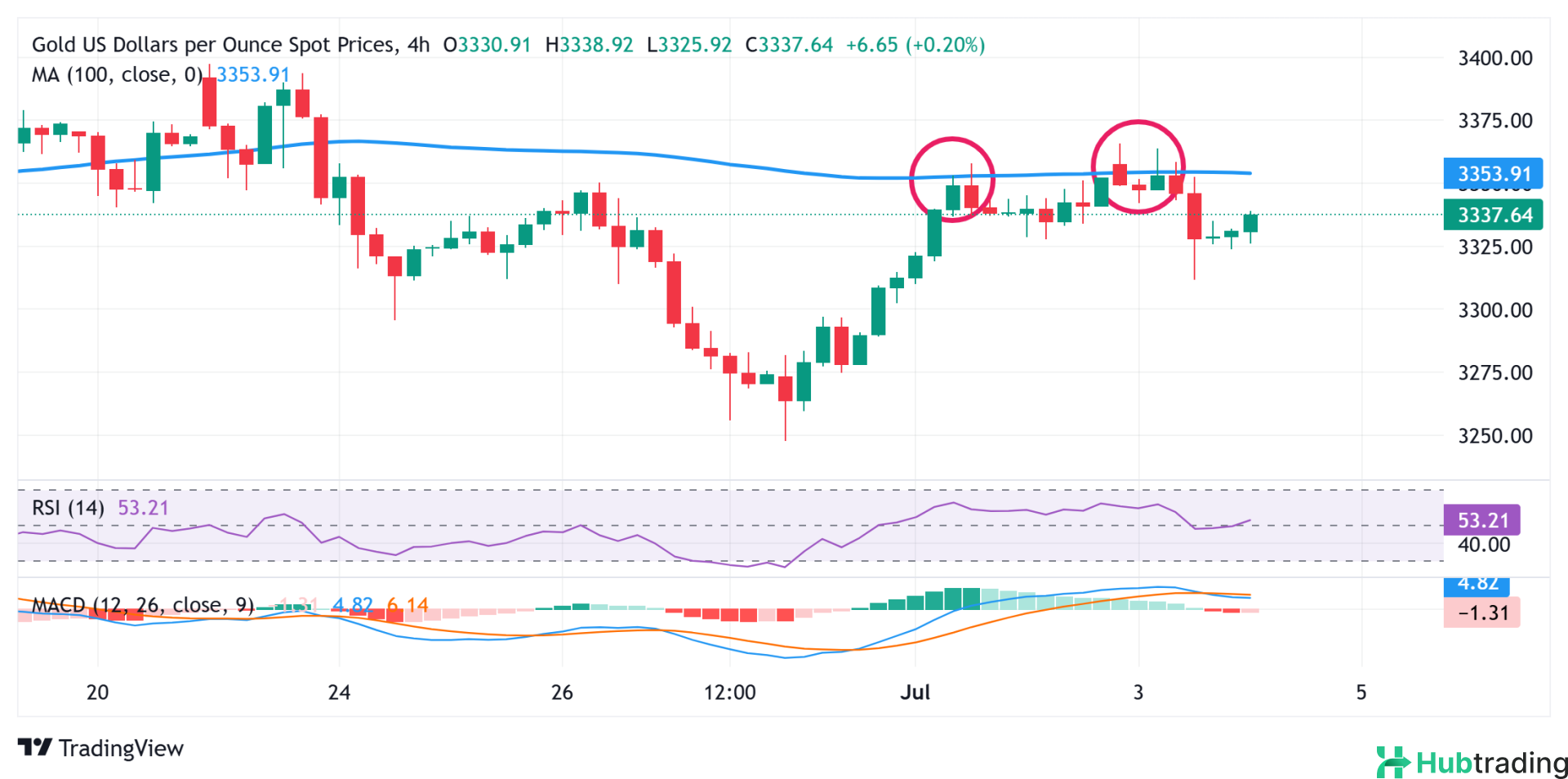 From a technical standpoint, gold is struggling to build momentum beyond the 100-period Simple Moving Average (SMA) on the 4-hour chart, which currently lies near the $3,352–$3,355 zone. This area remains a critical resistance level. A clear break above this barrier, followed by a move beyond the recent swing high near $3,365–$3,366, could pave the way toward the $3,400 psychological level.