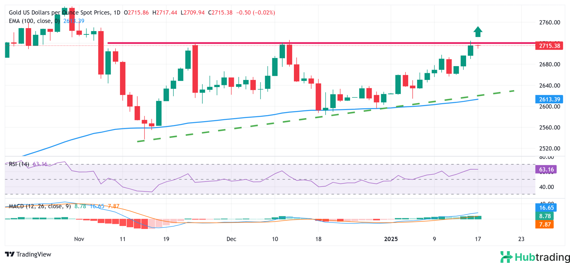 From a technical standpoint, positive oscillators on the daily chart suggest a bullish outlook, supporting the potential for further price increases. However, it would be prudent to wait for sustained strength and confirmation above the $2,715-$2,720 resistance zone before entering new long positions. Should this level be breached, gold could rise to the $2,745 resistance, followed by the $2,760-$2,762 area, and ultimately challenge its all-time high around $2,790, reached in October 2024.