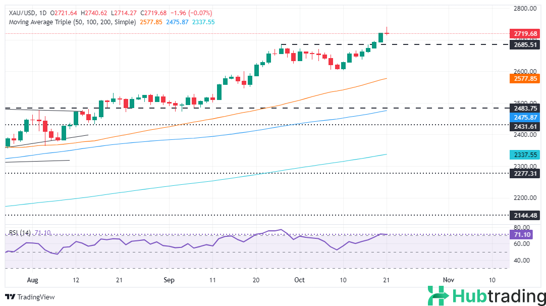 On the other hand, if the price retreats from record highs and falls below $2,700, it may trigger a pullback. Key support levels to watch include the October 17 high at $2,696 and the October 4 high at $2,670.