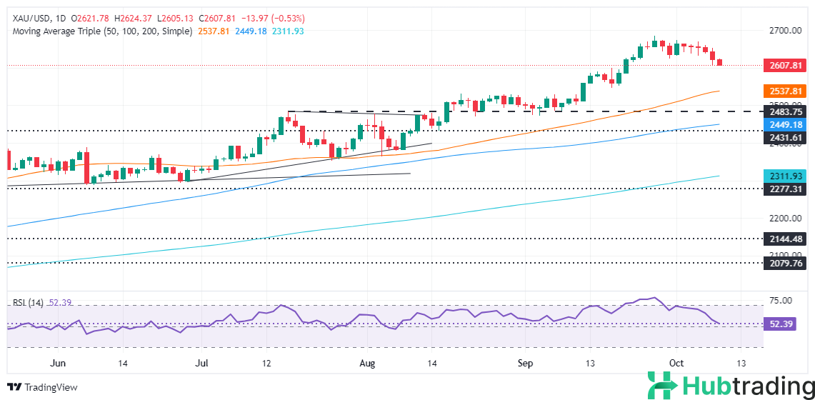 XAU/USD has broken below $2,620, with further declines potentially targeting the psychological level of $2,550 and the 50-day Simple Moving Average (SMA) at $2,537. If these levels are breached, the next support lies around $2,500.