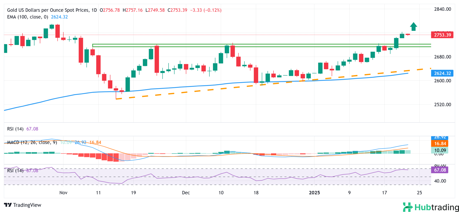 On the upside, initial resistance is seen near the overnight high of $2,763-$2,764. A break above this level could set the stage for a retest of the all-time high around the $2,790 mark, last touched in October. Further gains beyond the psychological $2,800 threshold would likely act as a catalyst for renewed bullish momentum, signaling an extension of the month-long uptrend.