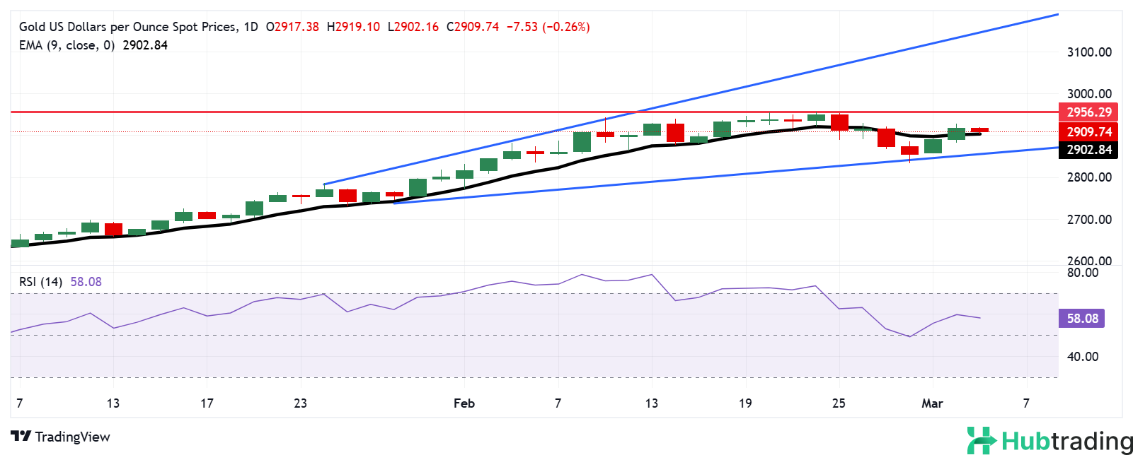 Gold price (XAU/USD) is trading around $2,910 per troy ounce on Wednesday, consolidating within an ascending channel pattern, which keeps the bullish bias intact. Technical analysis of the daily chart indicates that the 14-day Relative Strength Index (RSI) remains above 50, reinforcing a positive outlook for the metal.