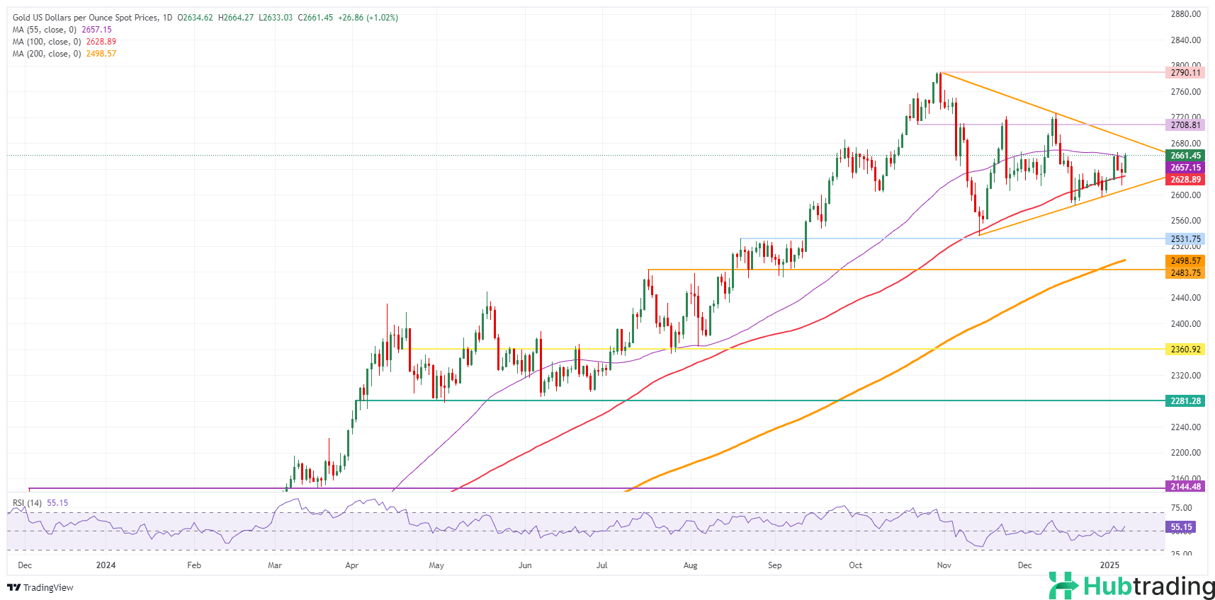 The 55-day SMA at $2,656 is the initial resistance to overcome, having proven to be a tough barrier twice last week. A decisive move above this level would target $2,688, aligning with the descending trendline of the pennant formation and marking the ultimate upside barrier in the near term.