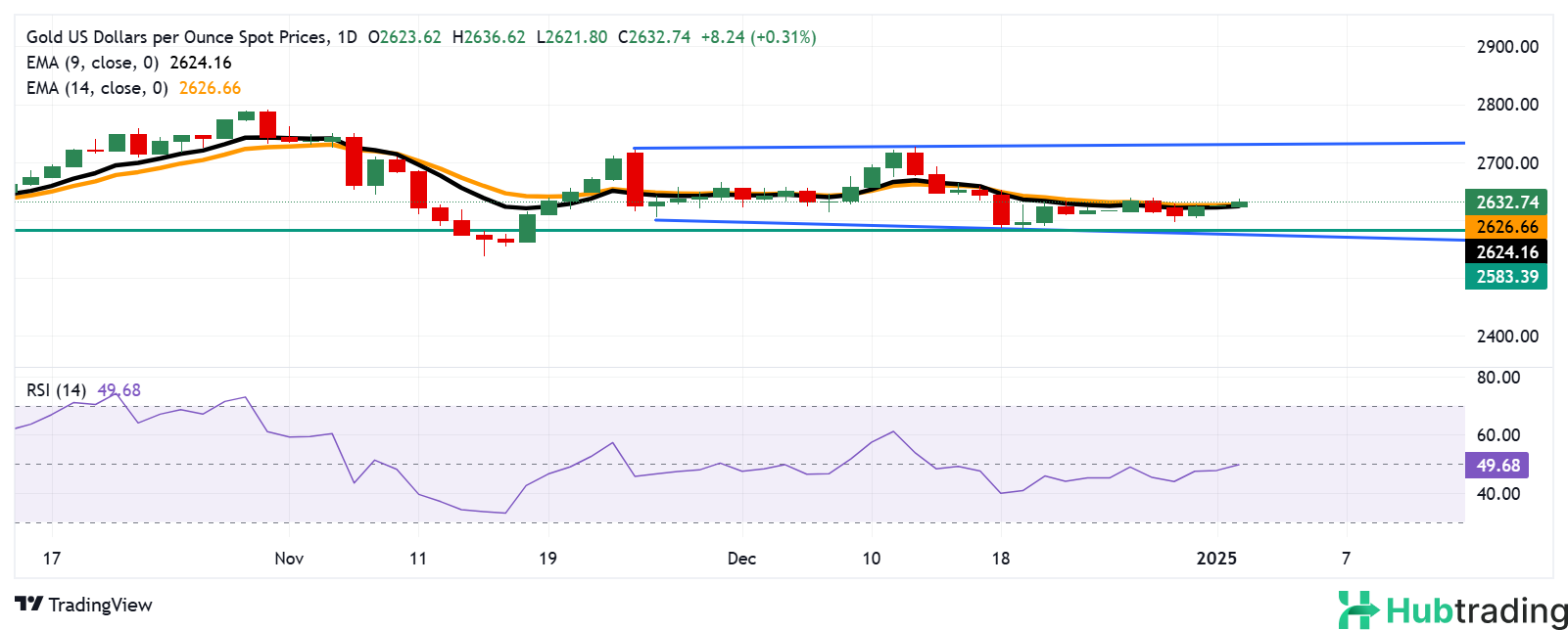 Gold price trades near $2,630 per troy ounce on Thursday, showing signs of consolidation as the yellow metal moves within a sideways range. The price has climbed above the nine- and 14-day Exponential Moving Averages (EMAs), signaling a potential bullish shift in short-term momentum. Meanwhile, the 14-day Relative Strength Index (RSI) remains near the neutral 50 level, indicating balanced sentiment.