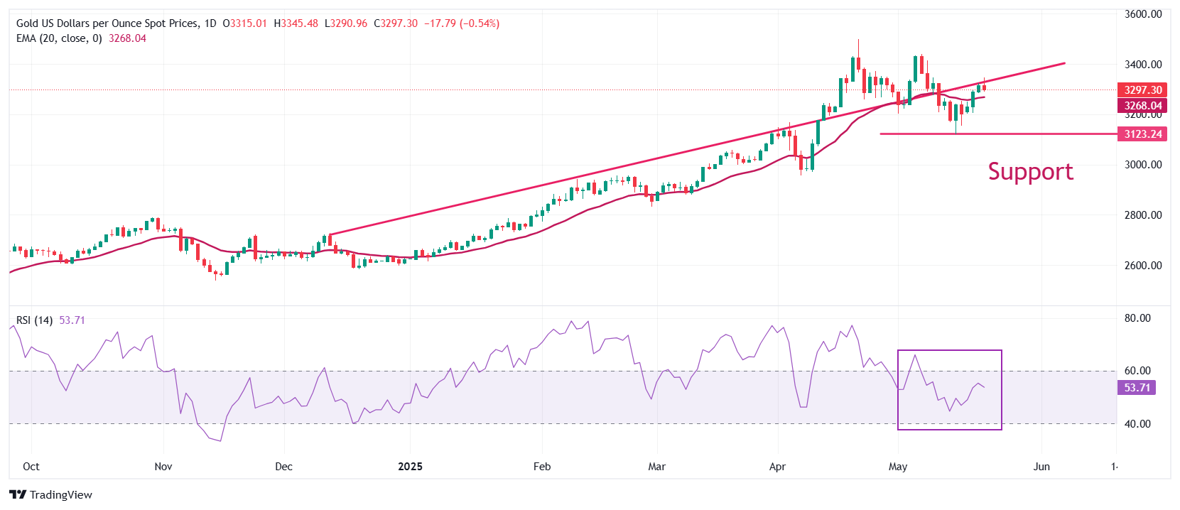 Gold (XAU/USD) slipped back toward $3,300 during Thursday's European session after reaching a two-week high of around $3,345 earlier in the day. The pullback in the precious metal follows a modest rebound in the US Dollar (USD), which gained traction after hitting a two-week low on Wednesday. The US Dollar Index (DXY), which measures the Greenback against six major currencies, rose 0.15% to around 99.85 at the time of writing, up from its recent low of 99.35.