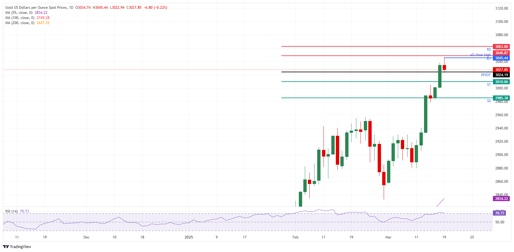 Gold price (XAU/USD) retreats slightly to around $3,030 on Wednesday after reaching a fresh all-time high of $3,045 earlier in the session. The rally was fueled by geopolitical tensions following the detention of Istanbul Mayor Ekrem Imamoglu, a key political rival of Turkish President Tayyip Erdogan, on charges of corruption and aiding a terrorist group.