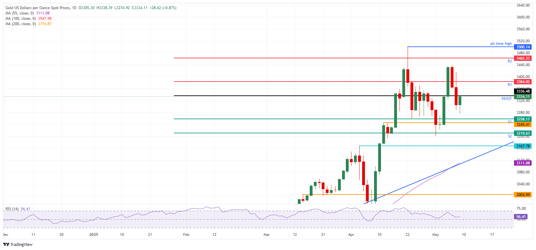 Gold (XAU/USD) edges up by nearly 1.0% on Friday, trading back above $3,335 at the time of writing. The upward momentum follows remarks by US President Donald Trump, who called on China to open its markets to the US, stating that an 80% tariff on Chinese goods "seems right." Gold prices had already begun to recover in early trading as markets labeled the US-UK trade agreement announced on Thursday as an "empty shell."