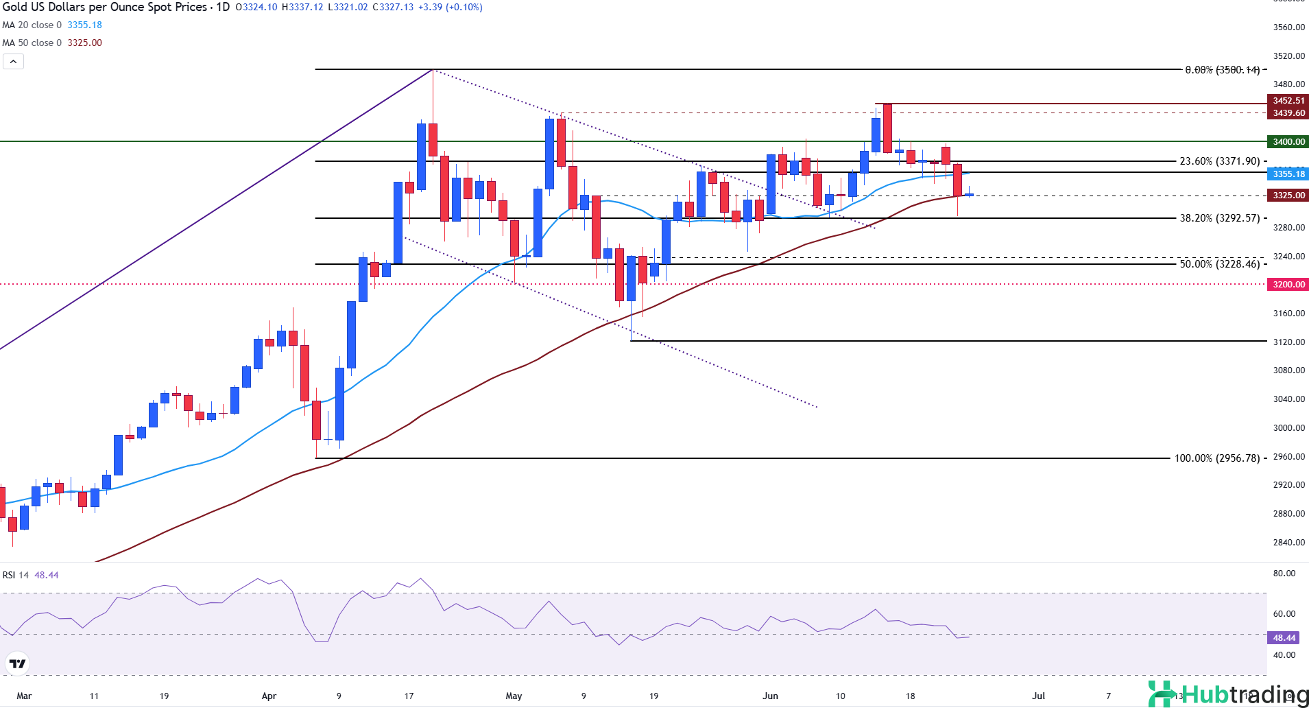 Gold (XAU/USD) is trading in a narrow range on Wednesday, as investor sentiment remains upbeat following Tuesday’s ceasefire between Israel and Iran.