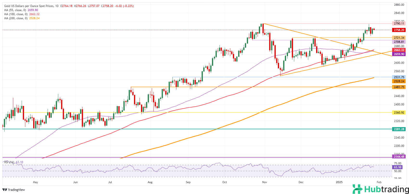 Gold remains within reach of its all-time high at $2,790, just about 1% above current levels.
