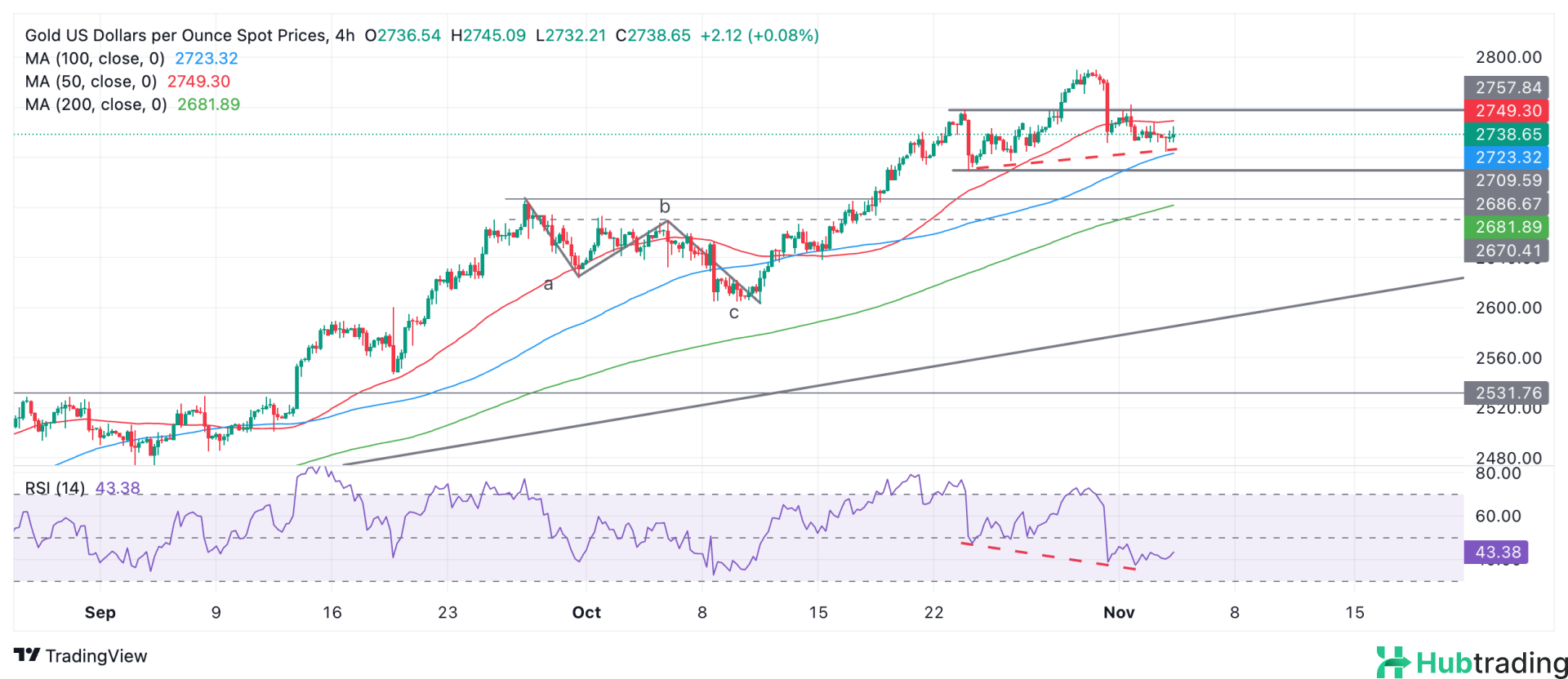 Gold (XAU/USD) continues its pullback from record highs, finding support at $2,724 early on Tuesday before rebounding to the $2,740s. A slightly weaker U.S. Dollar (USD), driven by uncertainty around the U.S. presidential election outcome, is aiding Gold’s recovery, as the precious metal is primarily priced and traded in USD.