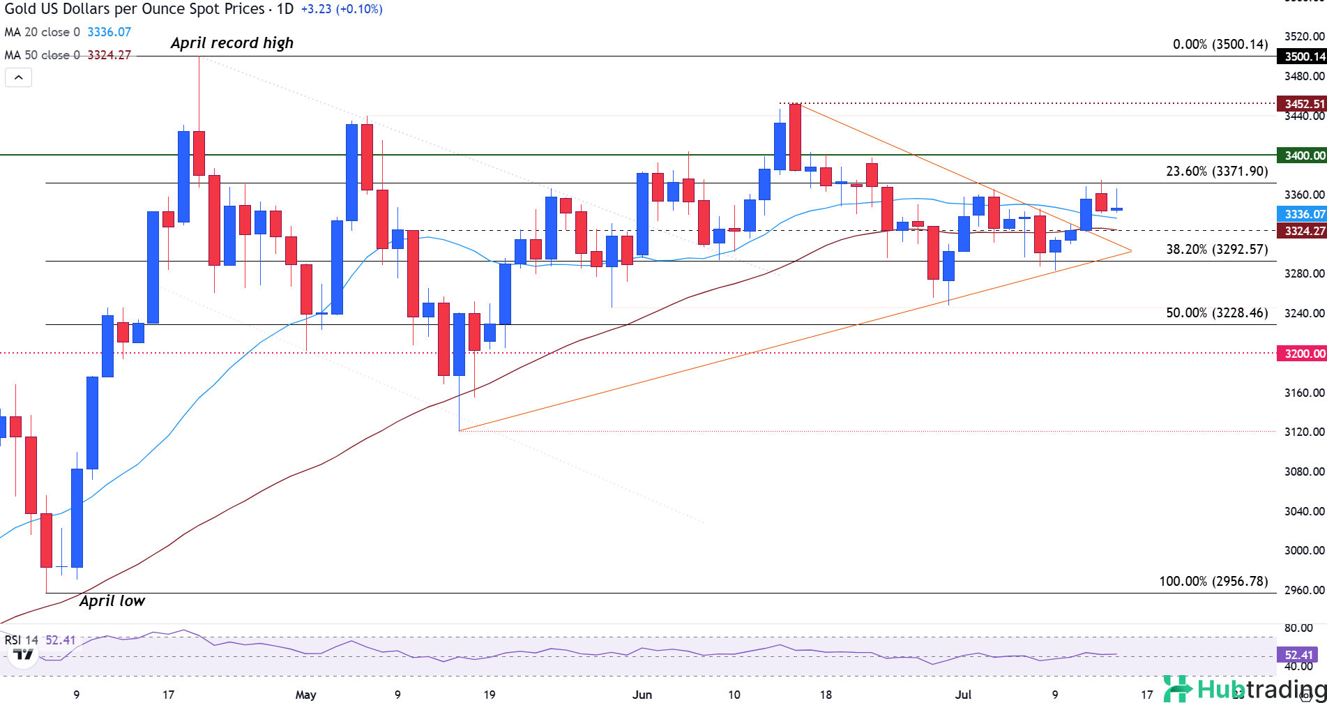 A clean move above $3,400 could expose the June high at $3,452 and set the stage for a retest of the record peak near $3,500. For now, however, momentum remains subdued, with the daily Relative Strength Index (RSI) hovering around 52, indicating a lack of strong directional conviction.