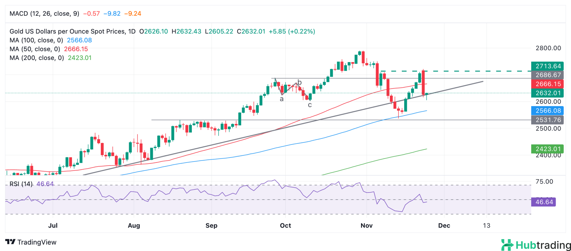 Gold’s price action has seen a notable pullback. The price sliced through the 50-day Simple Moving Average (SMA) at around $2,666, dropping to test a key trendline near $2,630, which marks the long-term uptrend for gold.