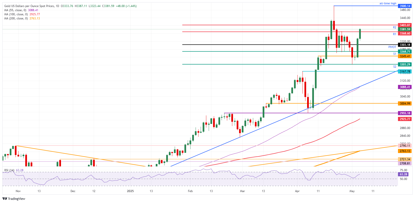 On the downside, initial support lies at the Pivot Point of $3,303. Below that, S1 at $3,268 aligns with several recent lows from late April, while $3,245 provides an additional key level to watch in case of a sharp pullback.
