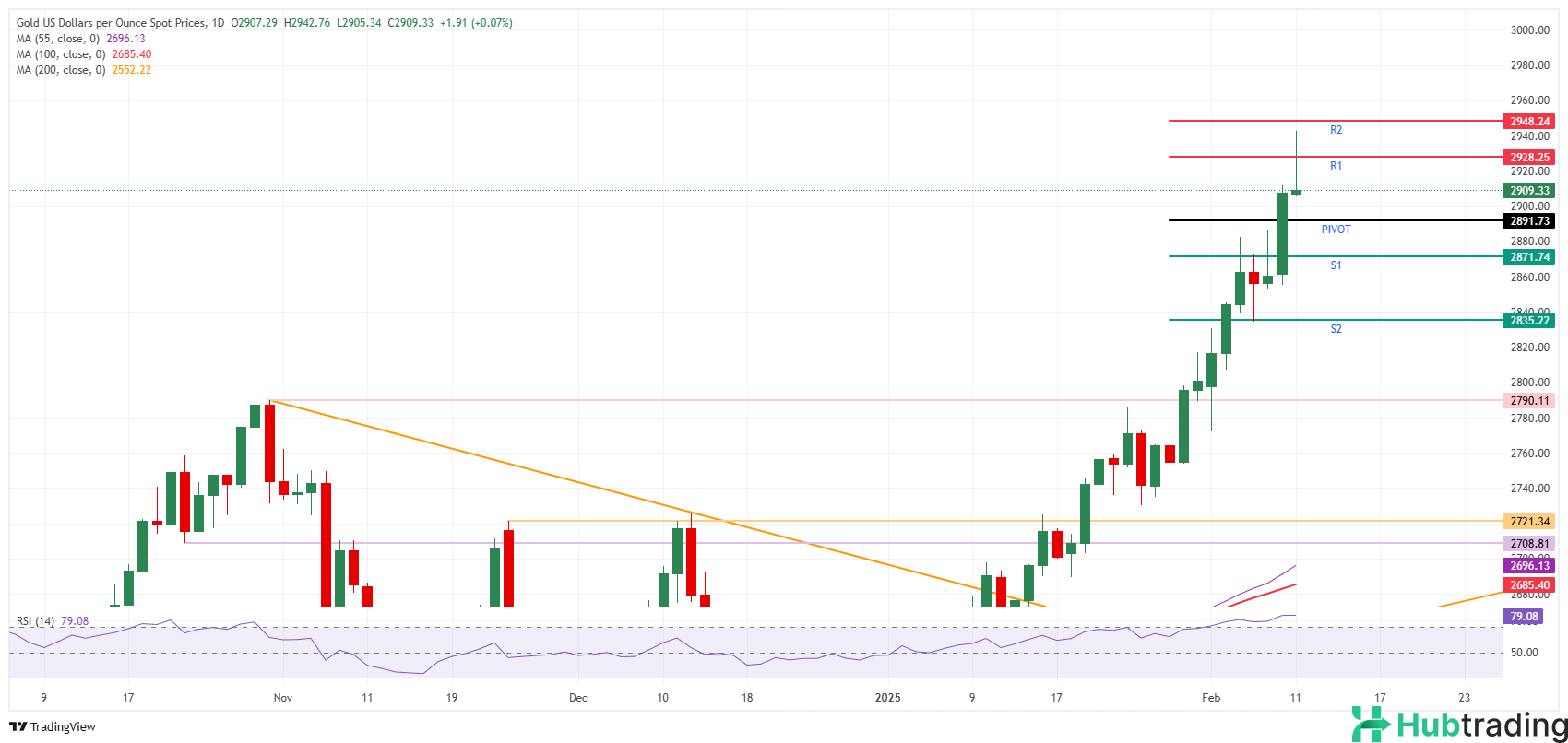 Gold (XAU/USD) set another all-time high at $2,942 in early Tuesday trading before retracing most of its gains. Meanwhile, U.S. President Donald Trump has implemented 25% tariffs on steel and aluminum imports for all countries starting March 12, while China has quietly responded with retaliatory tariffs on select U.S. goods. So far, China has taken a measured approach, while Trump has yet to follow through on his campaign promise of imposing 60% tariffs on all Chinese imports, according to Bloomberg.