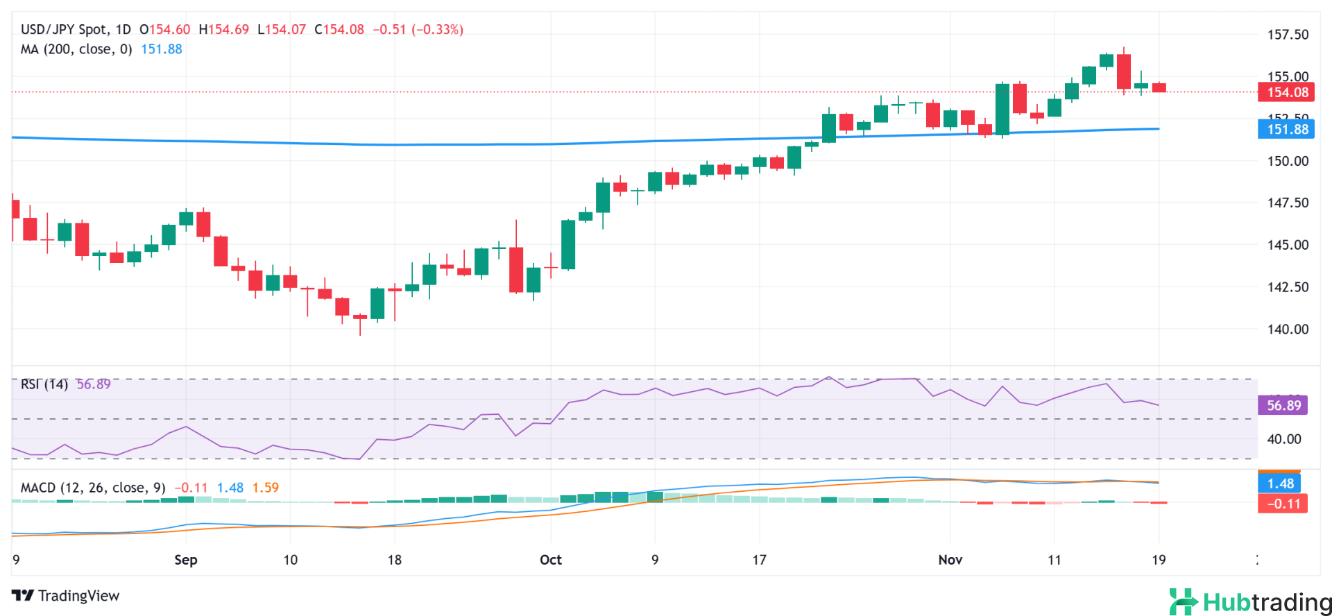 From a technical perspective, the USD/JPY pair's inability to sustain above the psychological 155.00 level on Monday, followed by a pullback, signals caution for bullish traders. However, the pair might continue to find support around the 153.85 region, bolstered by positive oscillators on the daily chart. A further sell-off could open the door for additional declines towards the 153.25 level, potentially testing the 153.00 mark and the next key support around the 152.70-152.65 zone. A decisive break below this level could expose the critical 200-day Simple Moving Average (SMA), now acting as support, which is currently near the 151.90-151.85 area.
