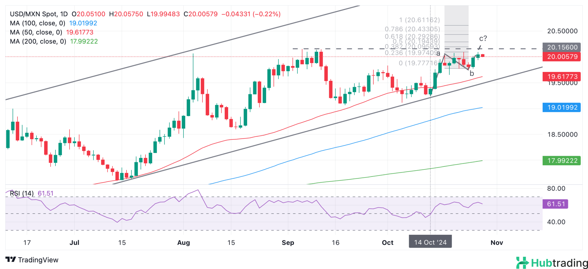 USD/MXN appears to be unfolding an upward “c wave” in a bullish “abc” pattern, which began from the October 14 low. The pair is targeting the Fibonacci 61.8% level of wave “a,” likely reaching 20.29 if it clears the wave “b” high at 20.09.