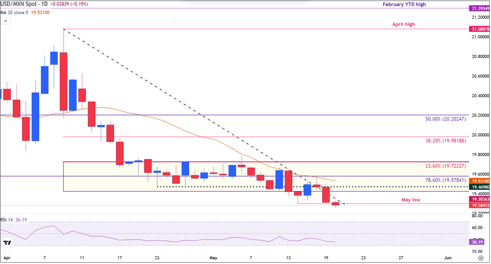 Conversely, if the US Dollar regains strength and breaks above the descending trendline, USD/MXN may retest the April low near 19.47, with the 20-day Simple Moving Average (SMA) at 19.53 coming into focus.