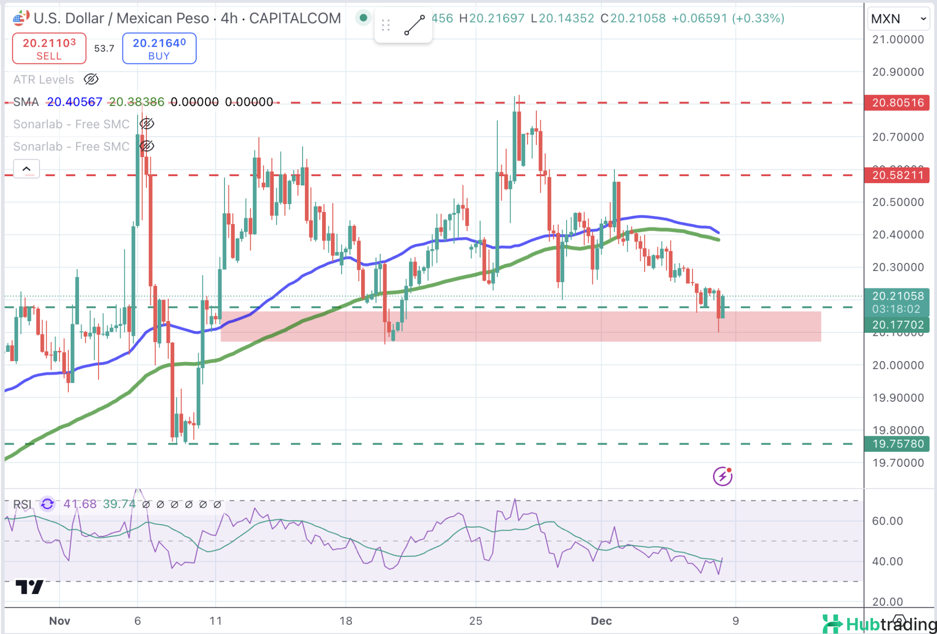 The immediate outlook for USD/MXN is bearish, as the pair has pulled back from the late November highs around 20.80. However, it is currently testing a strong support zone between 20.05 and 20.15.