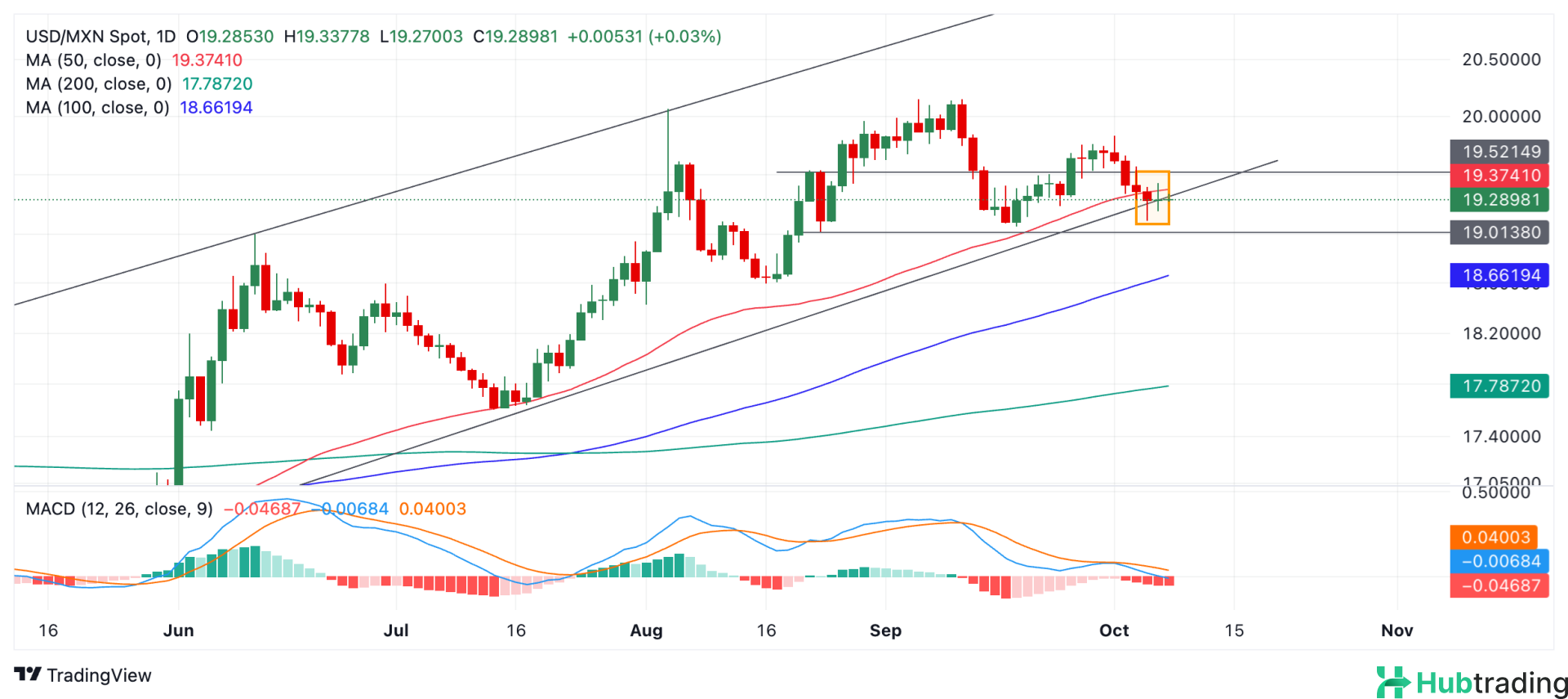 - The USD/MXN pair has fallen below the critical 50-day SMA and is testing the bottom of a significant rising channel.