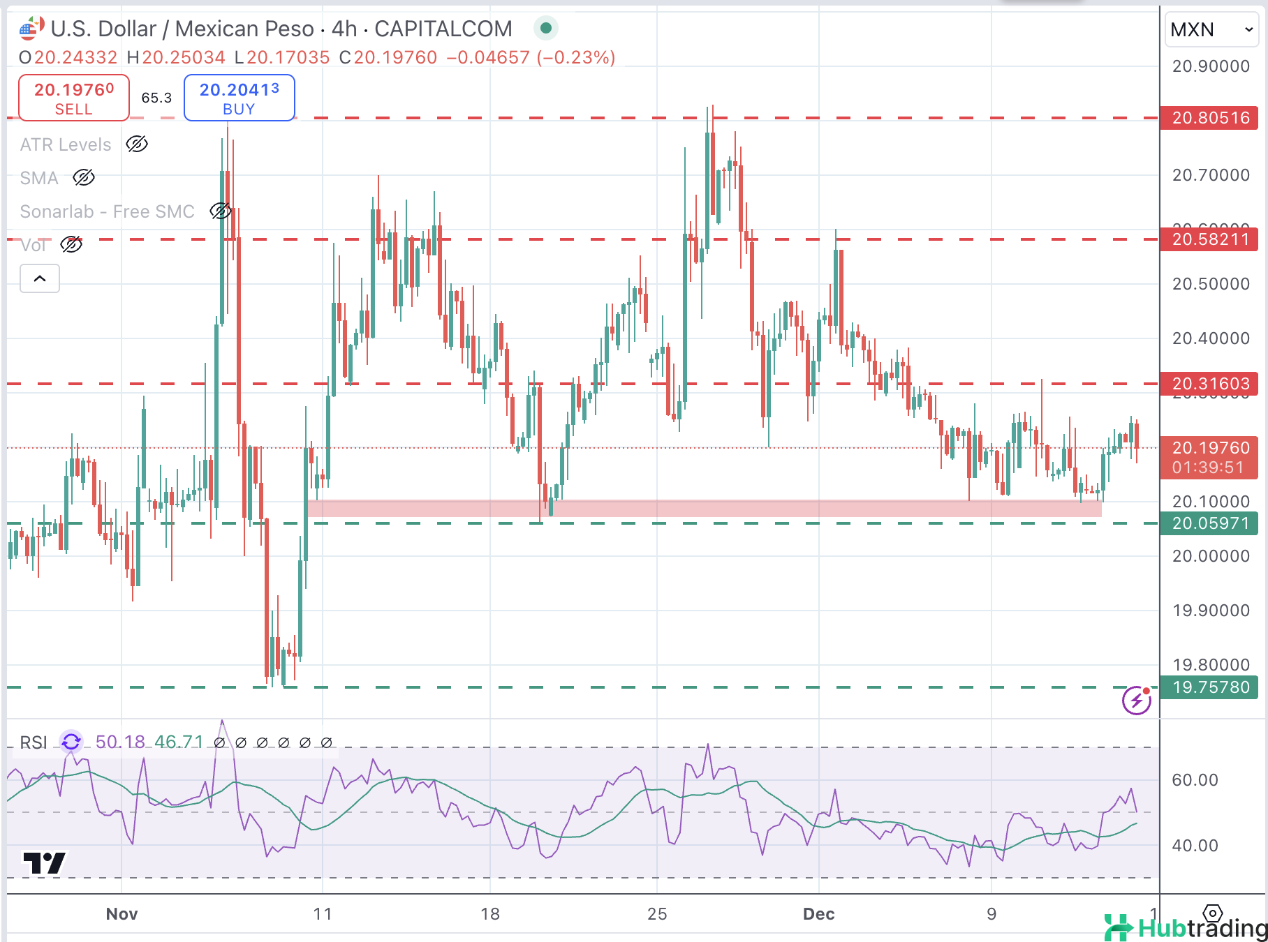 A break above 20.30 would shift focus toward the December 2 high at 20.60, followed by November’s peak around 20.80. On the downside, the 20.00 level continues to support the pair. A move below this level could target the October 24 and November 7 lows at 19.75.